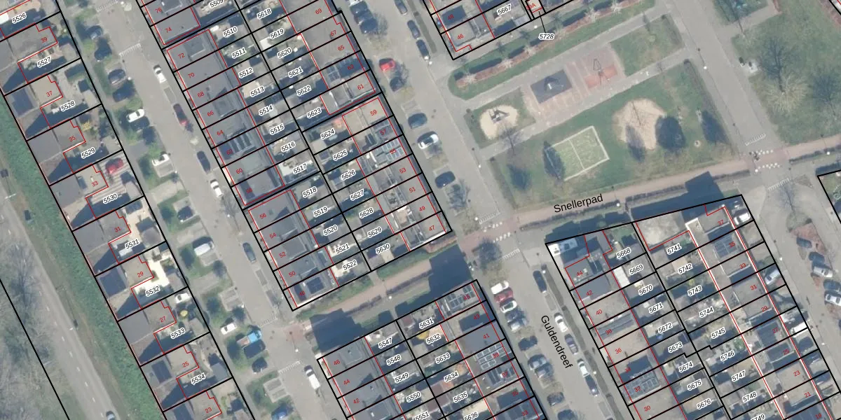 Guldendreef 49 is gelegen op kadastraal perceel WDN01A5629. Deze kadastrale aanduiding is uniek en wordt gebruikt door het Kadaster om eigendomsrechten en andere zakelijke rechten vast te leggen. Het perceel maakt onderdeel uit van de kadastrale gemeente Woerden.