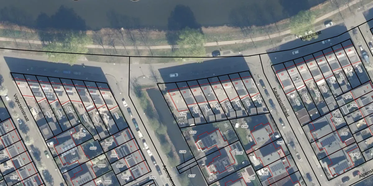Harzstraat 25 is gelegen op kadastraal perceel WDN01A6345. Deze kadastrale aanduiding is uniek en wordt gebruikt door het Kadaster om eigendomsrechten en andere zakelijke rechten vast te leggen. Het perceel maakt onderdeel uit van de kadastrale gemeente Woerden.