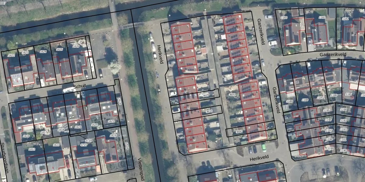 Het perceel waarop Herikveld 48 staat heeft een oppervlakte van 3468 m². Dit is een zeer groot perceel. De perceeloppervlakte wordt geregistreerd door het Kadaster. Gedetailleerde informatie over de maten van dit perceel kunt u vinden in het rapport Kadastrale kaart met maatvoering van Herikveld 48.
