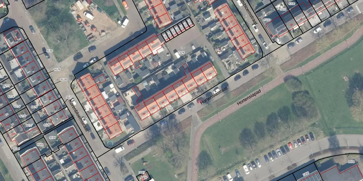Hortensiastraat 30 is gelegen op kadastraal perceel WDN01B7324. Deze kadastrale aanduiding is uniek en wordt gebruikt door het Kadaster om eigendomsrechten en andere zakelijke rechten vast te leggen. Het perceel maakt onderdeel uit van de kadastrale gemeente Woerden.