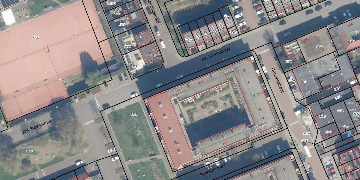 Jan Steenstraat 13 is gelegen op kadastraal perceel WDN01B9013. Deze kadastrale aanduiding is uniek en wordt gebruikt door het Kadaster om eigendomsrechten en andere zakelijke rechten vast te leggen. Het perceel maakt onderdeel uit van de kadastrale gemeente Woerden.