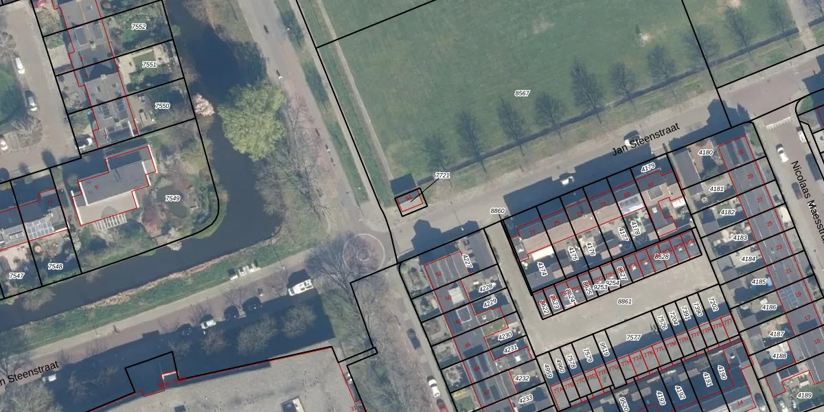 Jan Steenstraat 94 is gelegen op kadastraal perceel WDN01B7721. Deze kadastrale aanduiding is uniek en wordt gebruikt door het Kadaster om eigendomsrechten en andere zakelijke rechten vast te leggen. Het perceel maakt onderdeel uit van de kadastrale gemeente Woerden.