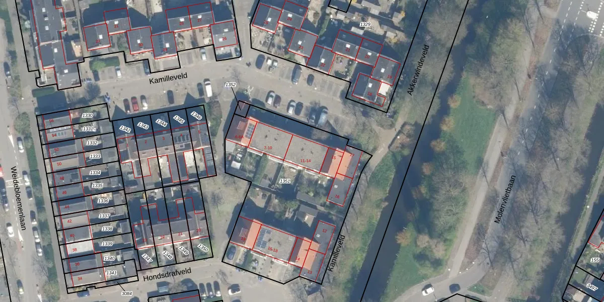 Kamilleveld 12 is gelegen op kadastraal perceel WDN01D1351. Deze kadastrale aanduiding is uniek en wordt gebruikt door het Kadaster om eigendomsrechten en andere zakelijke rechten vast te leggen. Het perceel maakt onderdeel uit van de kadastrale gemeente Woerden.