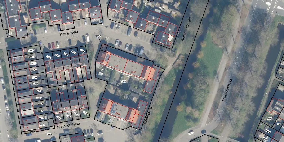 Kamilleveld 14 is gelegen op kadastraal perceel WDN01D1351. Deze kadastrale aanduiding is uniek en wordt gebruikt door het Kadaster om eigendomsrechten en andere zakelijke rechten vast te leggen. Het perceel maakt onderdeel uit van de kadastrale gemeente Woerden.