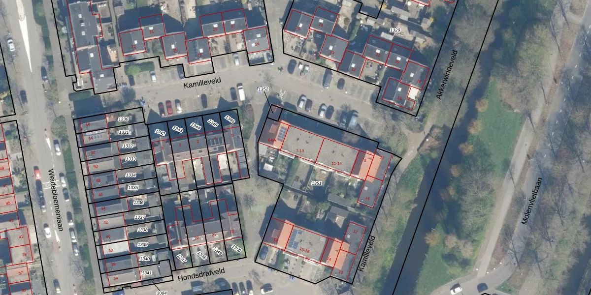 Kamilleveld 7 is gelegen op kadastraal perceel WDN01D1351. Deze kadastrale aanduiding is uniek en wordt gebruikt door het Kadaster om eigendomsrechten en andere zakelijke rechten vast te leggen. Het perceel maakt onderdeel uit van de kadastrale gemeente Woerden.