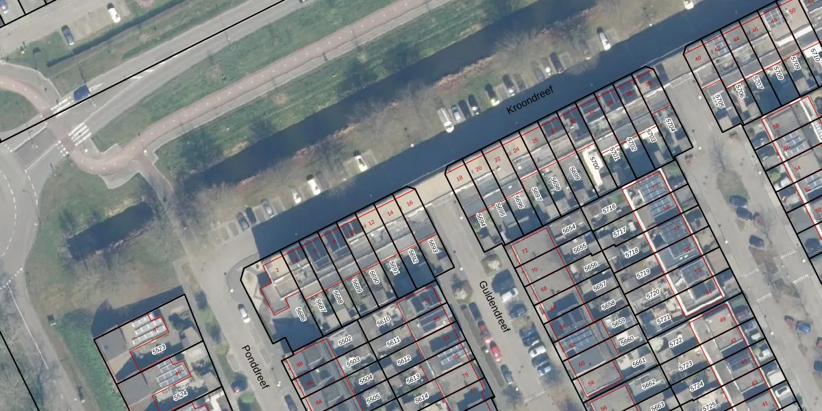 Kroondreef 16 is gelegen op kadastraal perceel WDN01A5693. Deze kadastrale aanduiding is uniek en wordt gebruikt door het Kadaster om eigendomsrechten en andere zakelijke rechten vast te leggen. Het perceel maakt onderdeel uit van de kadastrale gemeente Woerden.