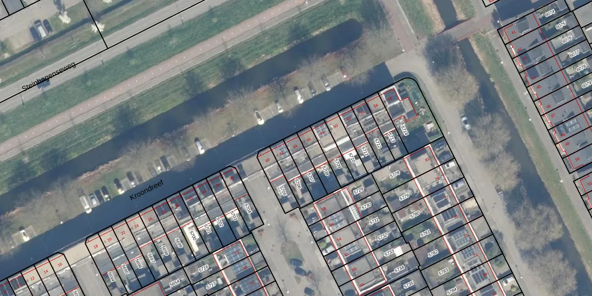 Kroondreef 44 is gelegen op kadastraal perceel WDN01A5707. Deze kadastrale aanduiding is uniek en wordt gebruikt door het Kadaster om eigendomsrechten en andere zakelijke rechten vast te leggen. Het perceel maakt onderdeel uit van de kadastrale gemeente Woerden.