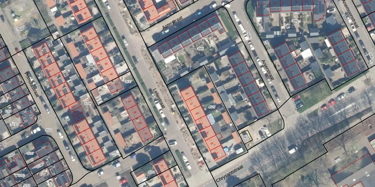 Leliestraat 45 is gelegen op kadastraal perceel WDN01B4525. Deze kadastrale aanduiding is uniek en wordt gebruikt door het Kadaster om eigendomsrechten en andere zakelijke rechten vast te leggen. Het perceel maakt onderdeel uit van de kadastrale gemeente Woerden.