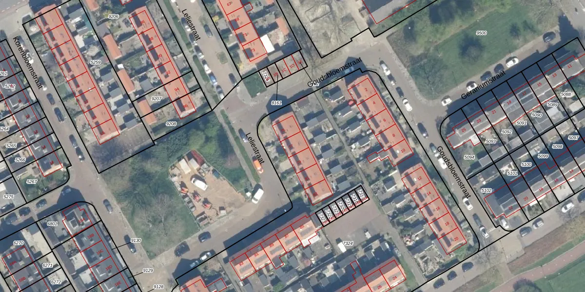 Het perceel waarop Leliestraat 77 staat heeft een oppervlakte van 5889 m². Dit is een zeer groot perceel. De perceeloppervlakte wordt geregistreerd door het Kadaster. Gedetailleerde informatie over de maten van dit perceel kunt u vinden in het rapport Kadastrale kaart met maatvoering van Leliestraat 77.