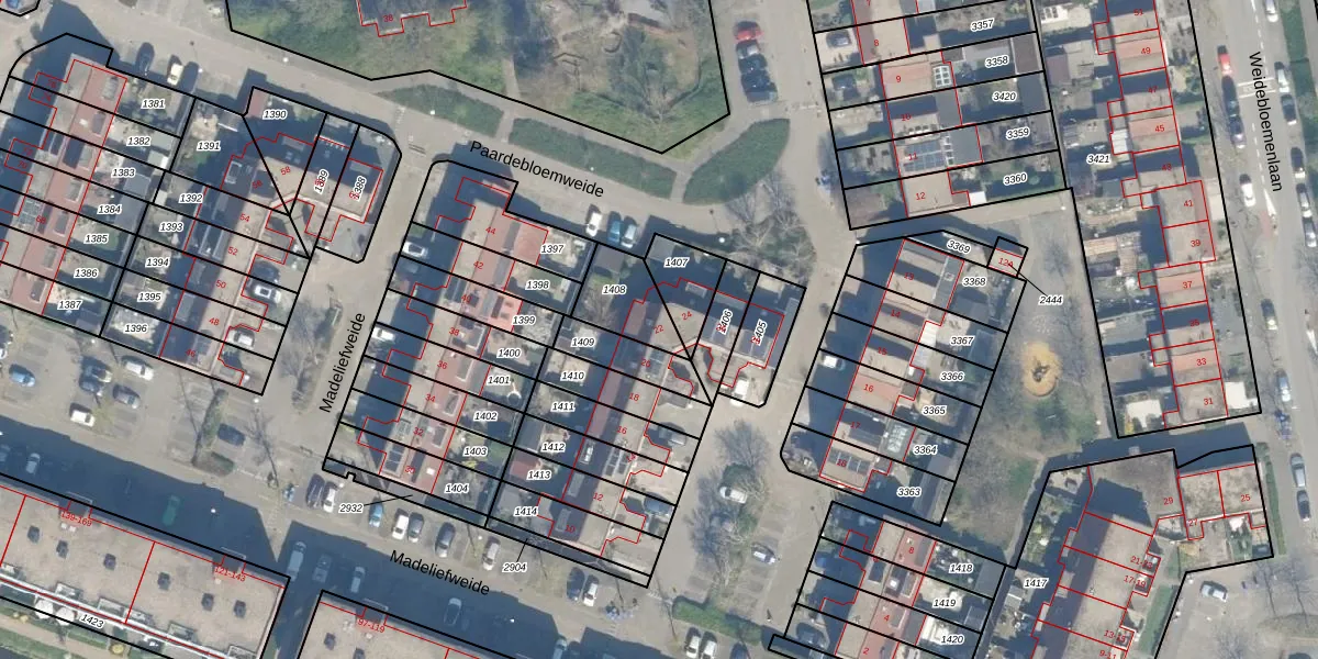 Madeliefweide 22 is gelegen op kadastraal perceel WDN01D1408. Deze kadastrale aanduiding is uniek en wordt gebruikt door het Kadaster om eigendomsrechten en andere zakelijke rechten vast te leggen. Het perceel maakt onderdeel uit van de kadastrale gemeente Woerden.