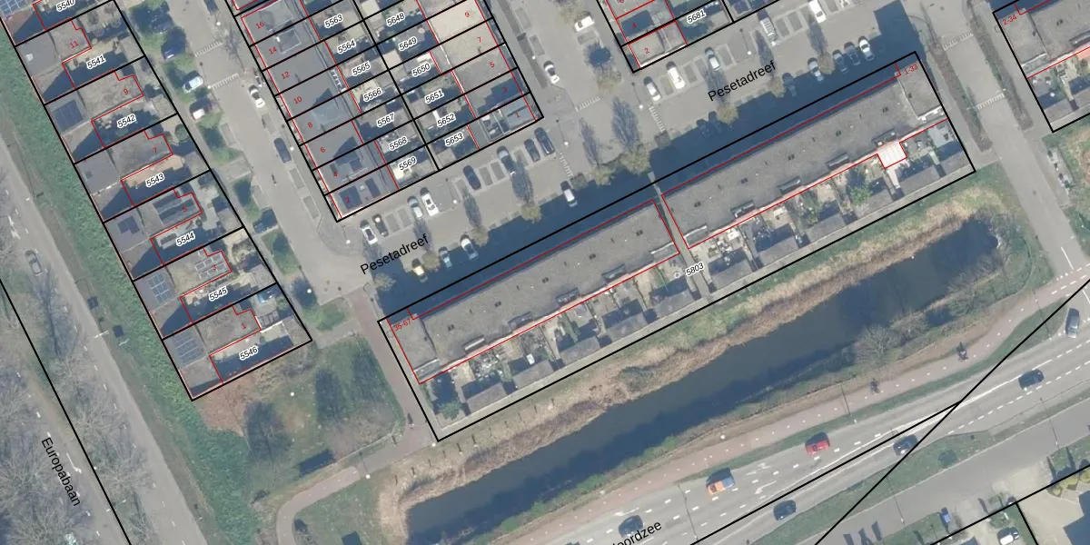 Het perceel waarop Pesetadreef 65 staat heeft een oppervlakte van 2701 m². Dit is een zeer groot perceel. De perceeloppervlakte wordt geregistreerd door het Kadaster. Gedetailleerde informatie over de maten van dit perceel kunt u vinden in het rapport Kadastrale kaart met maatvoering van Pesetadreef 65.
