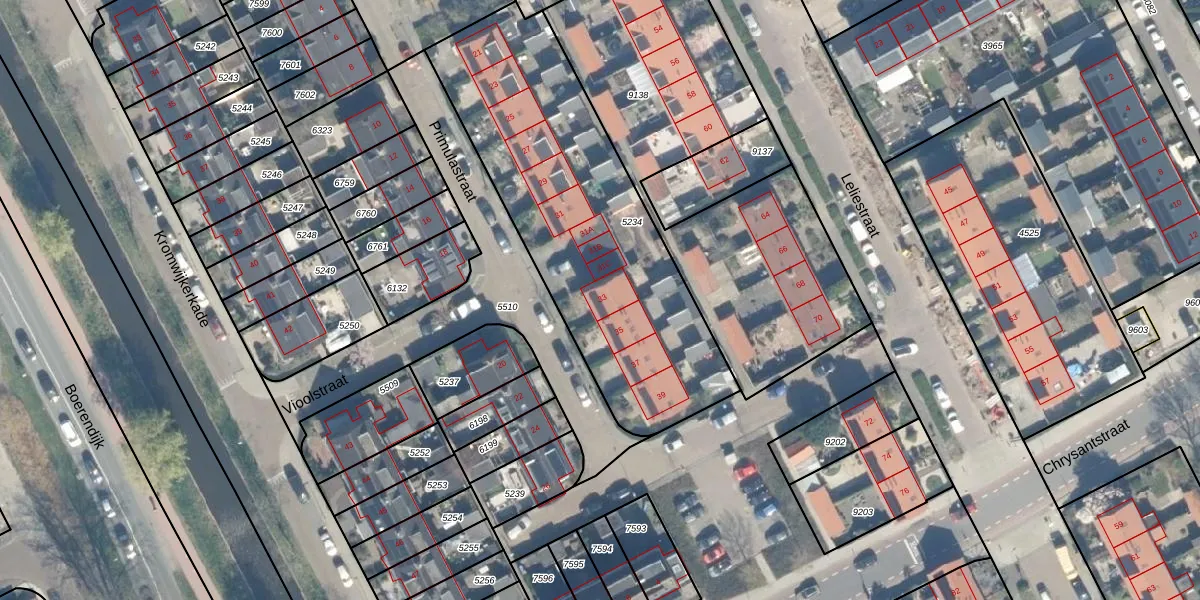 Primulastraat 33 is gelegen op kadastraal perceel WDN01B5234. Deze kadastrale aanduiding is uniek en wordt gebruikt door het Kadaster om eigendomsrechten en andere zakelijke rechten vast te leggen. Het perceel maakt onderdeel uit van de kadastrale gemeente Woerden.