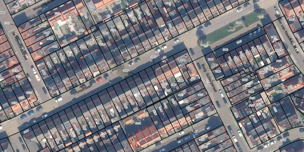 Prinsenlaan 53 is gelegen op kadastraal perceel WDN01B3055. Deze kadastrale aanduiding is uniek en wordt gebruikt door het Kadaster om eigendomsrechten en andere zakelijke rechten vast te leggen. Het perceel maakt onderdeel uit van de kadastrale gemeente Woerden.
