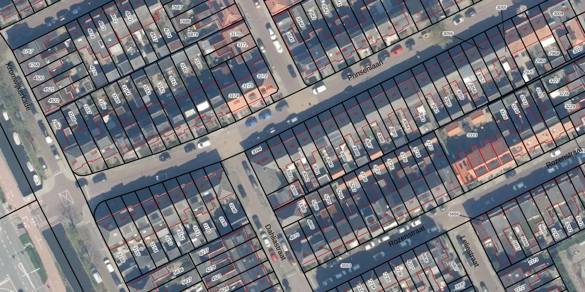 Het perceel waarop Prinsenlaan 85 staat heeft een oppervlakte van 107 m². Dit is een middelgroot perceel. De perceeloppervlakte wordt geregistreerd door het Kadaster. Gedetailleerde informatie over de maten van dit perceel kunt u vinden in het rapport Kadastrale kaart met maatvoering van Prinsenlaan 85.