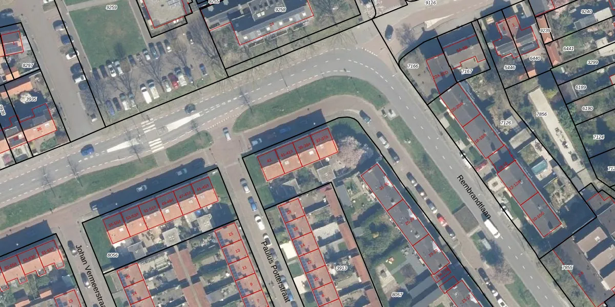 Het perceel waarop Rembrandtlaan 39-I staat heeft een oppervlakte van 3920 m². Dit is een zeer groot perceel. De perceeloppervlakte wordt geregistreerd door het Kadaster. Gedetailleerde informatie over de maten van dit perceel kunt u vinden in het rapport Kadastrale kaart met maatvoering van Rembrandtlaan 39-I.