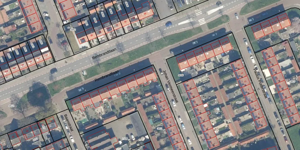 Het perceel waarop Rembrandtlaan 61-I staat heeft een oppervlakte van 2900 m². Dit is een zeer groot perceel. De perceeloppervlakte wordt geregistreerd door het Kadaster. Gedetailleerde informatie over de maten van dit perceel kunt u vinden in het rapport Kadastrale kaart met maatvoering van Rembrandtlaan 61-I.