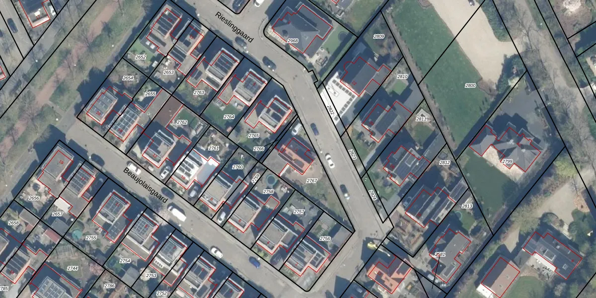 Het perceel waarop Rieslinggaard 1 staat heeft een oppervlakte van 409 m². Dit is een groot perceel. De perceeloppervlakte wordt geregistreerd door het Kadaster. Gedetailleerde informatie over de maten van dit perceel kunt u vinden in het rapport Kadastrale kaart met maatvoering van Rieslinggaard 1.