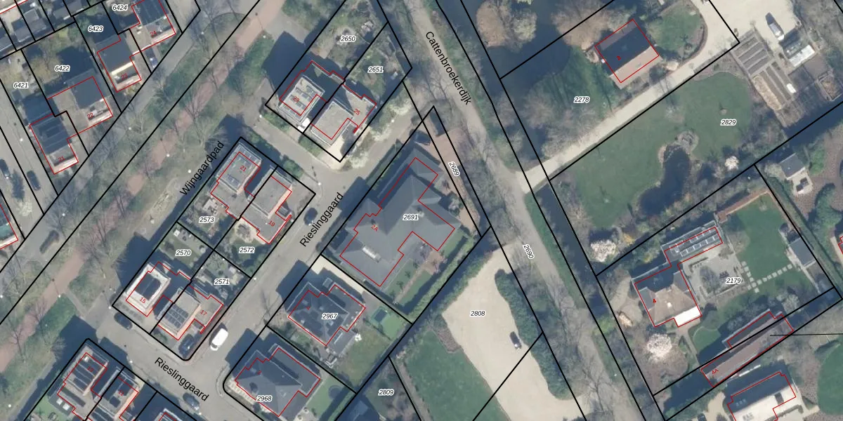 Rieslinggaard 6 is gelegen op kadastraal perceel WDN01E2691. Deze kadastrale aanduiding is uniek en wordt gebruikt door het Kadaster om eigendomsrechten en andere zakelijke rechten vast te leggen. Het perceel maakt onderdeel uit van de kadastrale gemeente Woerden.