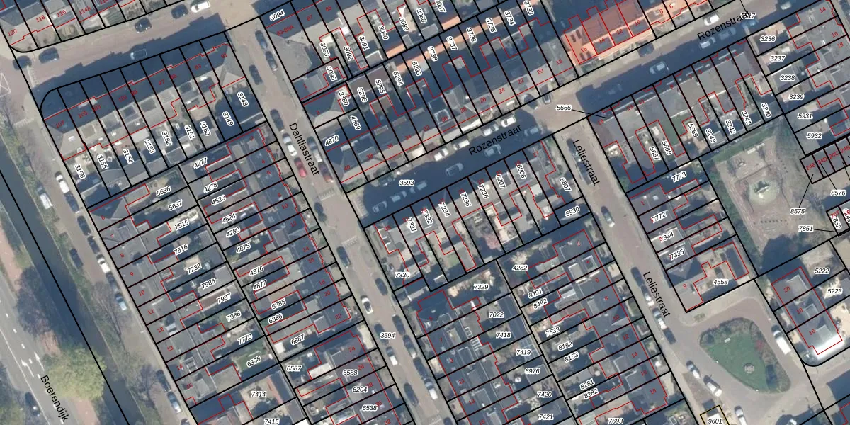 Gebruik de zoekbalk of klik op een perceel voor informatie over de adressen binnen dit perceel.