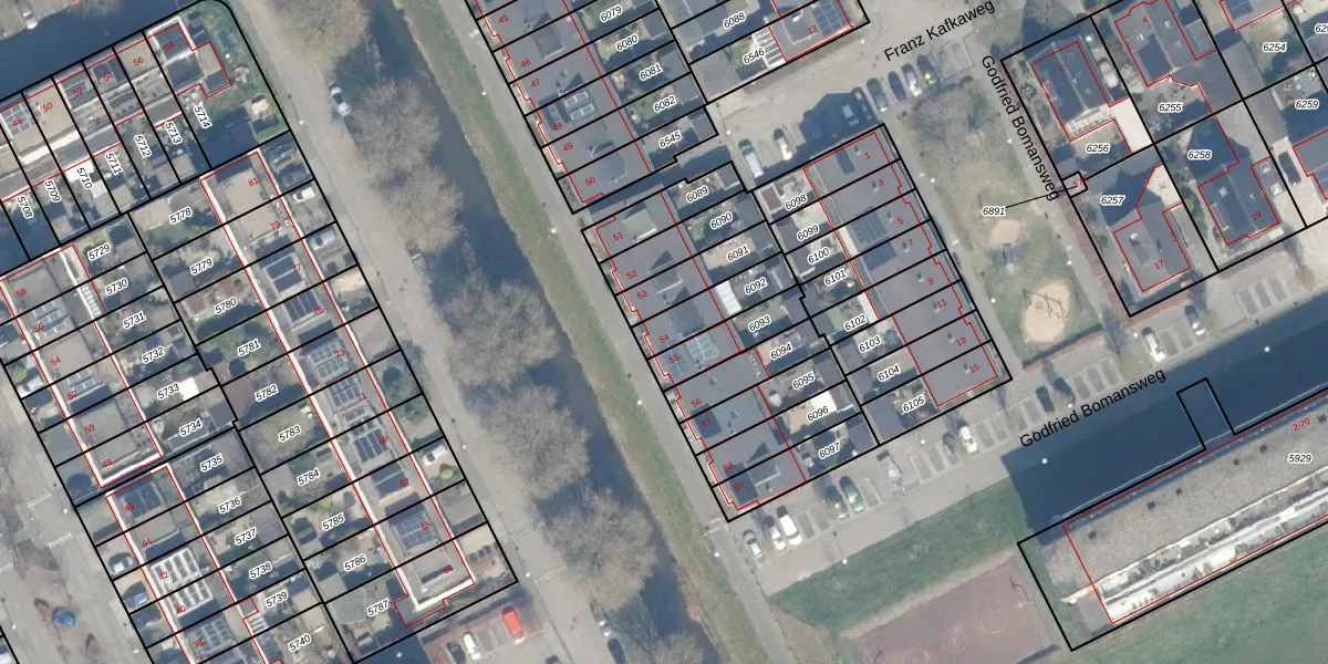 Het perceel waarop het adres ligt is WDN01-A-6092. De afkorting 'WDN01' staat voor kadastrale gemeente Woerden. Het perceel is kleiner dan gemiddeld in Woerden. Het perceel is 138 m² groot, terwijl het gemiddelde ligt op 1326,16 m². Het grootste perceel in de kadastrale gemeente is 55,0 ha. Het kleinste perceel heeft een oppervlakte van 0 m². Dit is het enige adres dat aanwezig is op het perceel. De laatste wijziging in het de Basisregistratie Kadaster (BRK) was op 18-12-2003.