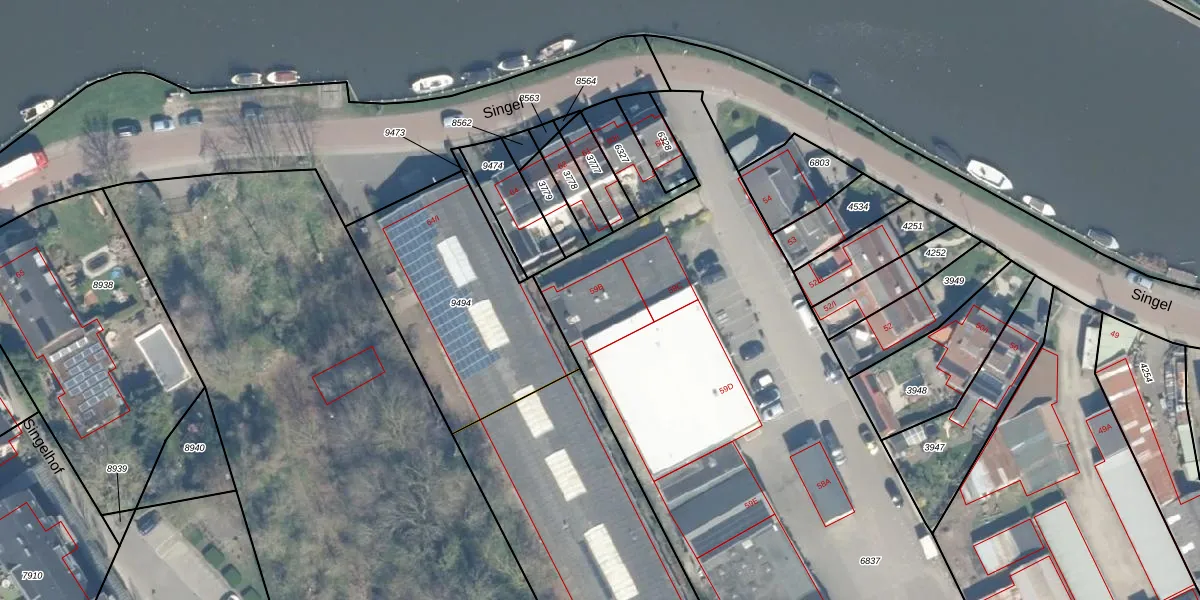Het perceel waarop Singel 59-B staat heeft een oppervlakte van 4980 m². Dit is een zeer groot perceel. De perceeloppervlakte wordt geregistreerd door het Kadaster. Gedetailleerde informatie over de maten van dit perceel kunt u vinden in het rapport Kadastrale kaart met maatvoering van Singel 59-B.