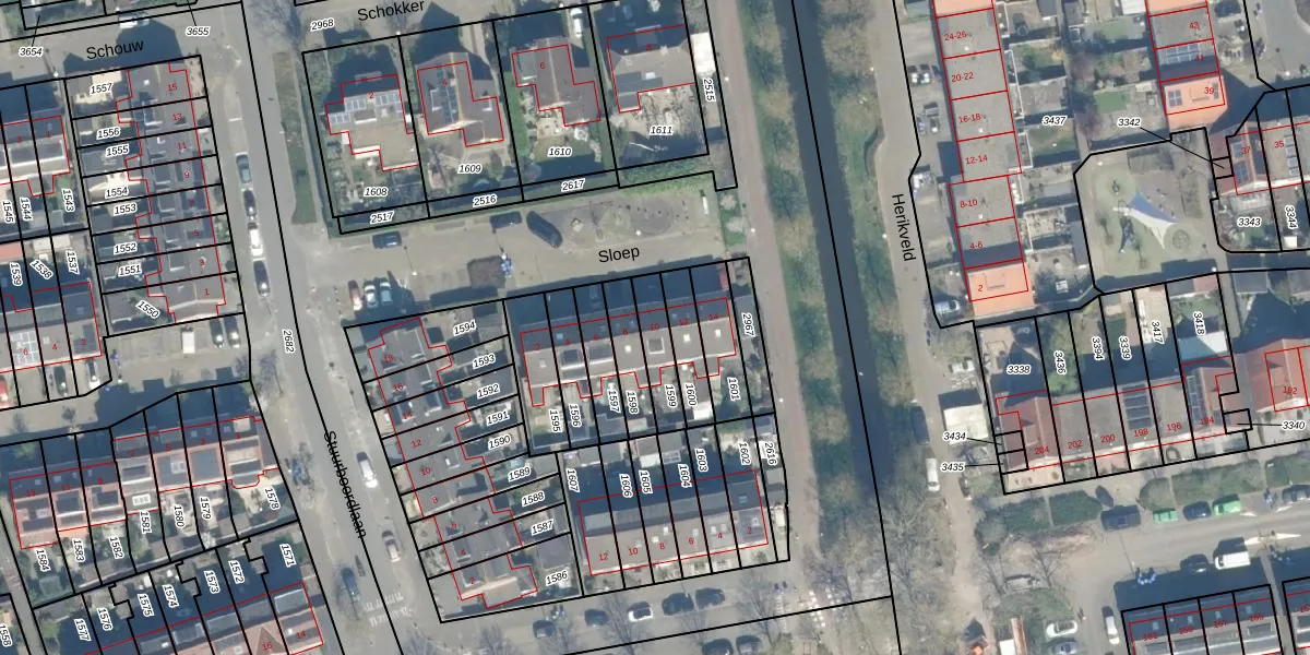 Gebruik de zoekbalk of klik op een perceel voor informatie over de adressen binnen dit perceel.