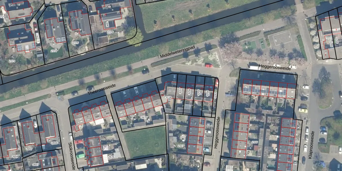 Theeroosweide 54 is gelegen op kadastraal perceel WDN01D3118. Deze kadastrale aanduiding is uniek en wordt gebruikt door het Kadaster om eigendomsrechten en andere zakelijke rechten vast te leggen. Het perceel maakt onderdeel uit van de kadastrale gemeente Woerden.