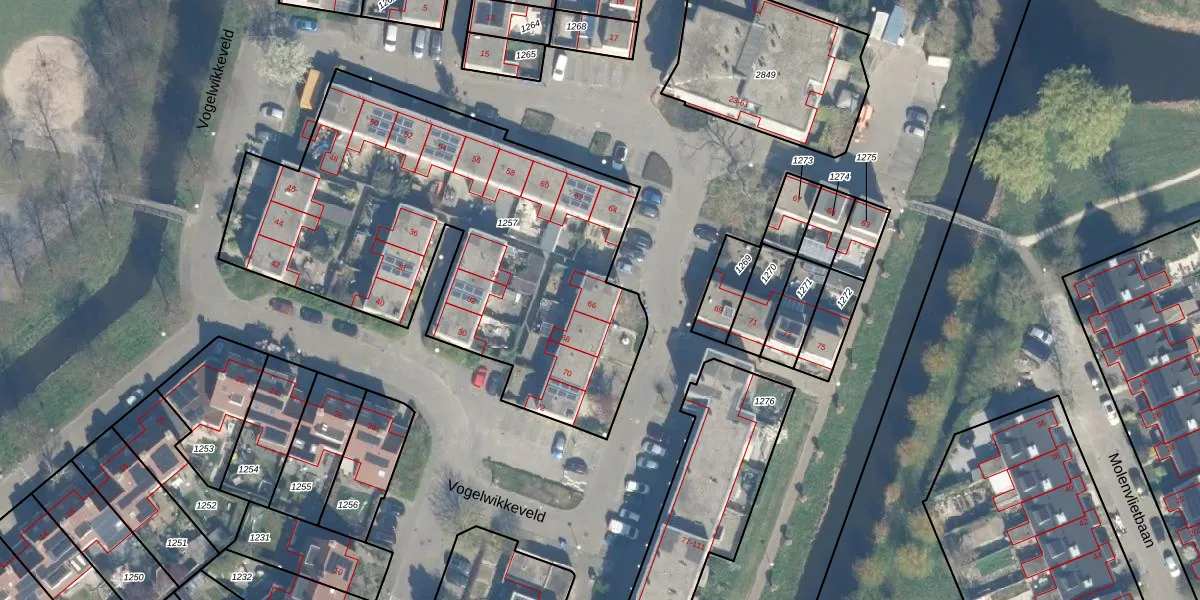 Het perceel waarop Vogelwikkeveld 66 staat heeft een oppervlakte van 2324 m². Dit is een zeer groot perceel. De perceeloppervlakte wordt geregistreerd door het Kadaster. Gedetailleerde informatie over de maten van dit perceel kunt u vinden in het rapport Kadastrale kaart met maatvoering van Vogelwikkeveld 66.