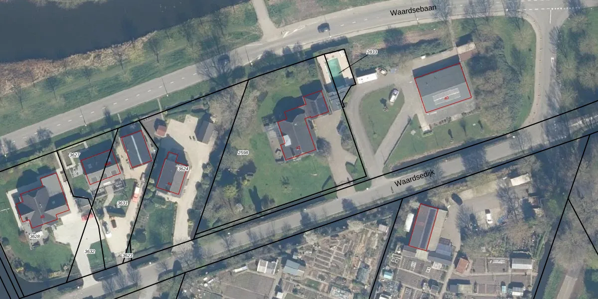 Het perceel waarop Waardsedijk 42 staat heeft een oppervlakte van 1900 m². Dit is een zeer groot perceel. De perceeloppervlakte wordt geregistreerd door het Kadaster. Gedetailleerde informatie over de maten van dit perceel kunt u vinden in het rapport Kadastrale kaart met maatvoering van Waardsedijk 42.