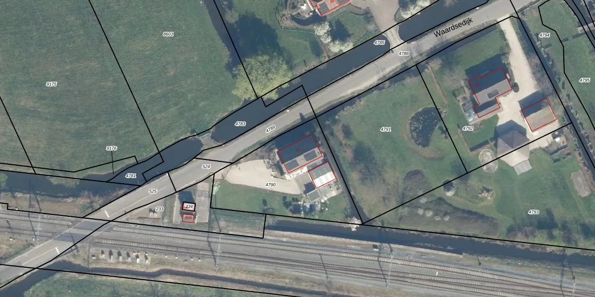 Het perceel waarop Waardsedijk 45 staat heeft een oppervlakte van 990 m². Dit is een groot perceel. De perceeloppervlakte wordt geregistreerd door het Kadaster. Gedetailleerde informatie over de maten van dit perceel kunt u vinden in het rapport Kadastrale kaart met maatvoering van Waardsedijk 45.