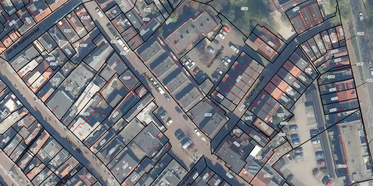 Het perceel waarop Warmoeshof 22 staat heeft een oppervlakte van 1328 m². Dit is een zeer groot perceel. De perceeloppervlakte wordt geregistreerd door het Kadaster. Gedetailleerde informatie over de maten van dit perceel kunt u vinden in het rapport Kadastrale kaart met maatvoering van Warmoeshof 22.