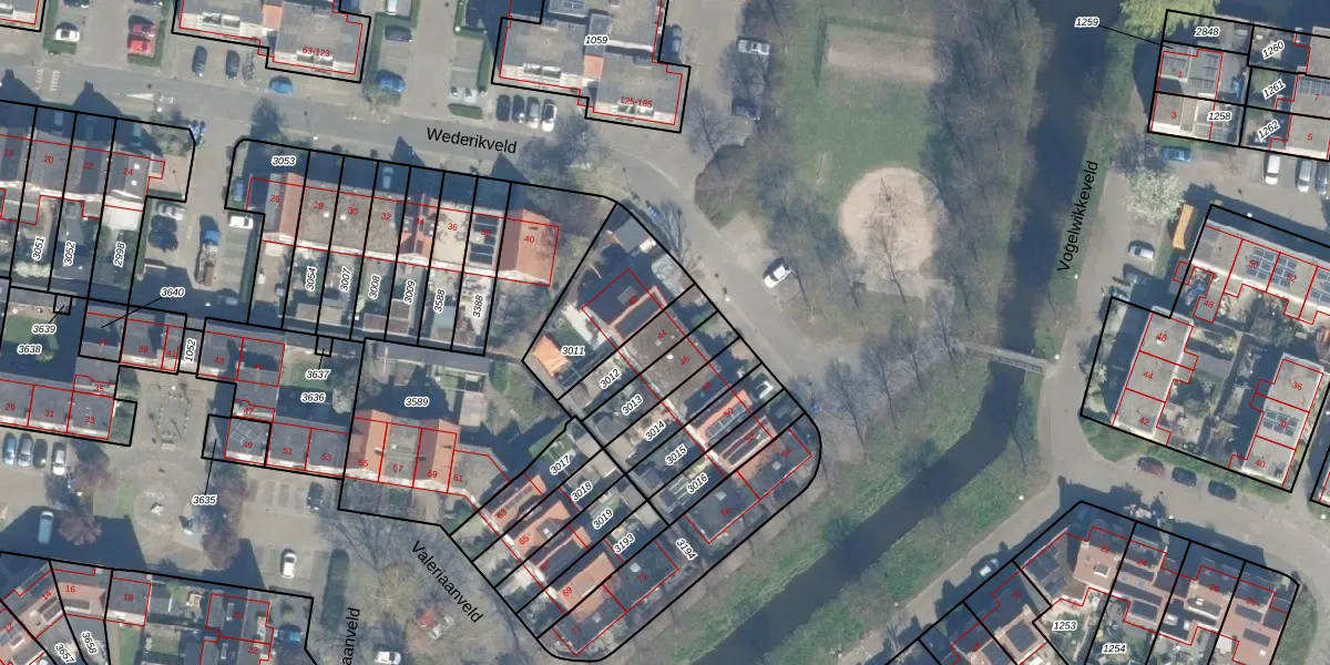 Wederikveld 44 is gelegen op kadastraal perceel WDN01D3012. Deze kadastrale aanduiding is uniek en wordt gebruikt door het Kadaster om eigendomsrechten en andere zakelijke rechten vast te leggen. Het perceel maakt onderdeel uit van de kadastrale gemeente Woerden.