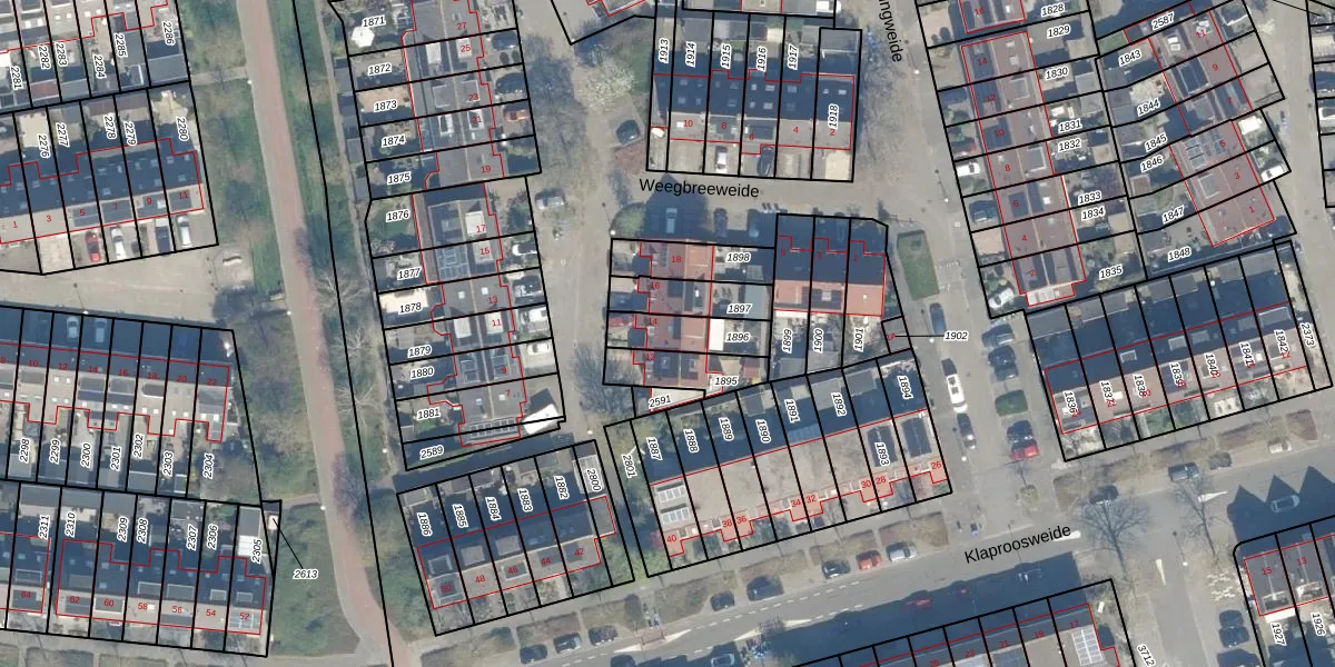 Weegbreeweide 14 is gelegen op kadastraal perceel WDN01D1896. Deze kadastrale aanduiding is uniek en wordt gebruikt door het Kadaster om eigendomsrechten en andere zakelijke rechten vast te leggen. Het perceel maakt onderdeel uit van de kadastrale gemeente Woerden.