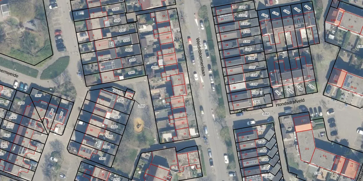 Weidebloemenlaan 39 is gelegen op kadastraal perceel WDN01D3421. Deze kadastrale aanduiding is uniek en wordt gebruikt door het Kadaster om eigendomsrechten en andere zakelijke rechten vast te leggen. Het perceel maakt onderdeel uit van de kadastrale gemeente Woerden.