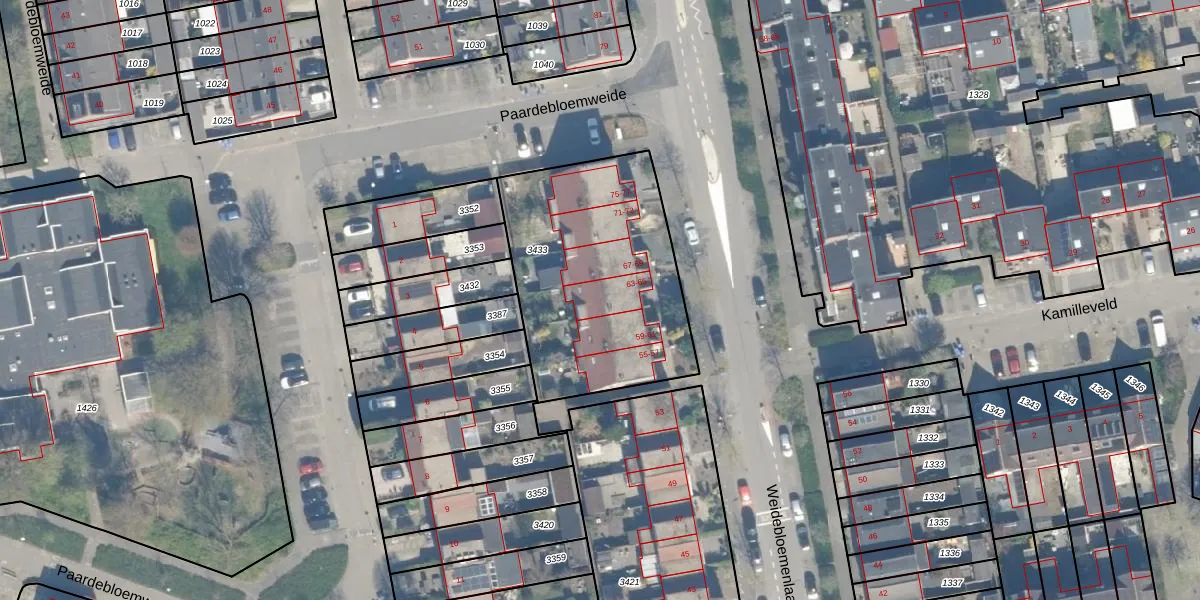 Weidebloemenlaan 65 is gelegen op kadastraal perceel WDN01D3433. Deze kadastrale aanduiding is uniek en wordt gebruikt door het Kadaster om eigendomsrechten en andere zakelijke rechten vast te leggen. Het perceel maakt onderdeel uit van de kadastrale gemeente Woerden.