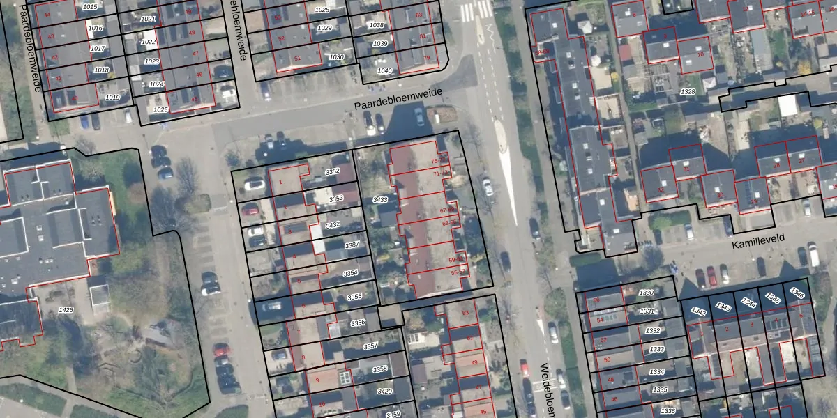 Weidebloemenlaan 67 is gelegen op kadastraal perceel WDN01D3433. Deze kadastrale aanduiding is uniek en wordt gebruikt door het Kadaster om eigendomsrechten en andere zakelijke rechten vast te leggen. Het perceel maakt onderdeel uit van de kadastrale gemeente Woerden.