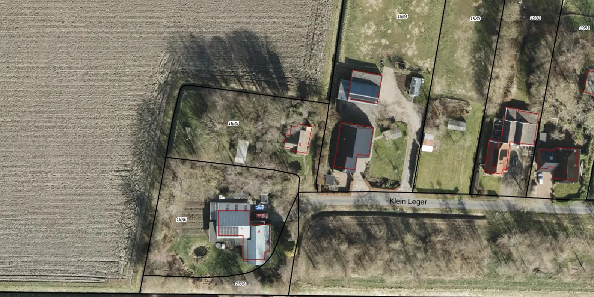 Het perceel waarop Klein Leger 5 staat heeft een oppervlakte van 1290 m². Dit is een zeer groot perceel. De perceeloppervlakte wordt geregistreerd door het Kadaster. Gedetailleerde informatie over de maten van dit perceel kunt u vinden in het rapport Kadastrale kaart met maatvoering van Klein Leger 5.