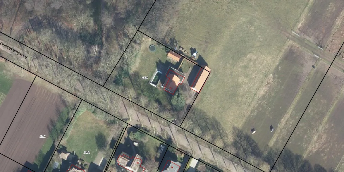 Het perceel waarop Duitsekampweg 41 staat heeft een oppervlakte van 1845 m². Dit is een zeer groot perceel. De perceeloppervlakte wordt geregistreerd door het Kadaster. Gedetailleerde informatie over de maten van dit perceel kunt u vinden in het rapport Kadastrale kaart met maatvoering van Duitsekampweg 41.
