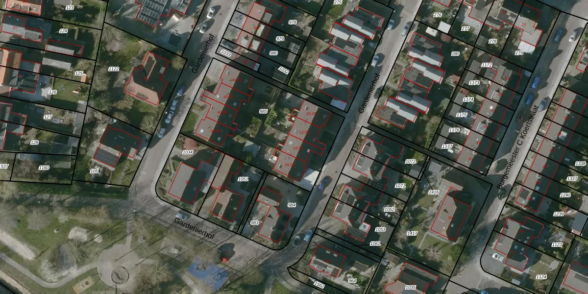 Het perceel waarop Gardenierhof 14 staat heeft een oppervlakte van 1373 m². Dit is een zeer groot perceel. De perceeloppervlakte wordt geregistreerd door het Kadaster. Gedetailleerde informatie over de maten van dit perceel kunt u vinden in het rapport Kadastrale kaart met maatvoering van Gardenierhof 14.