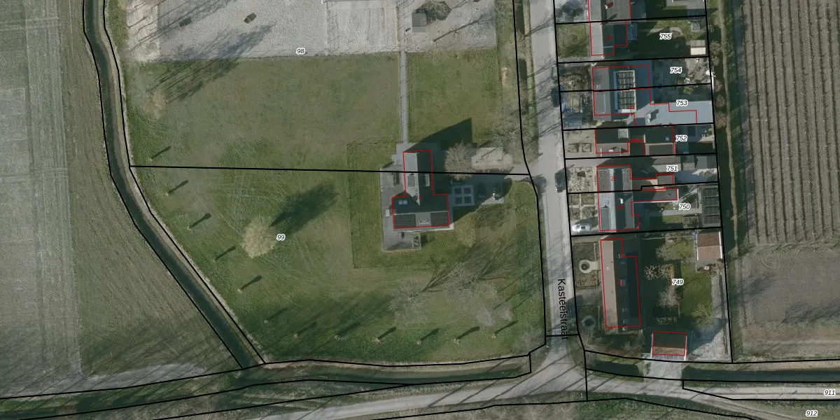 Het perceel waarop Kasteelstraat 4 staat heeft een oppervlakte van 3750 m². Dit is een zeer groot perceel. De perceeloppervlakte wordt geregistreerd door het Kadaster. Gedetailleerde informatie over de maten van dit perceel kunt u vinden in het rapport Kadastrale kaart met maatvoering van Kasteelstraat 4.