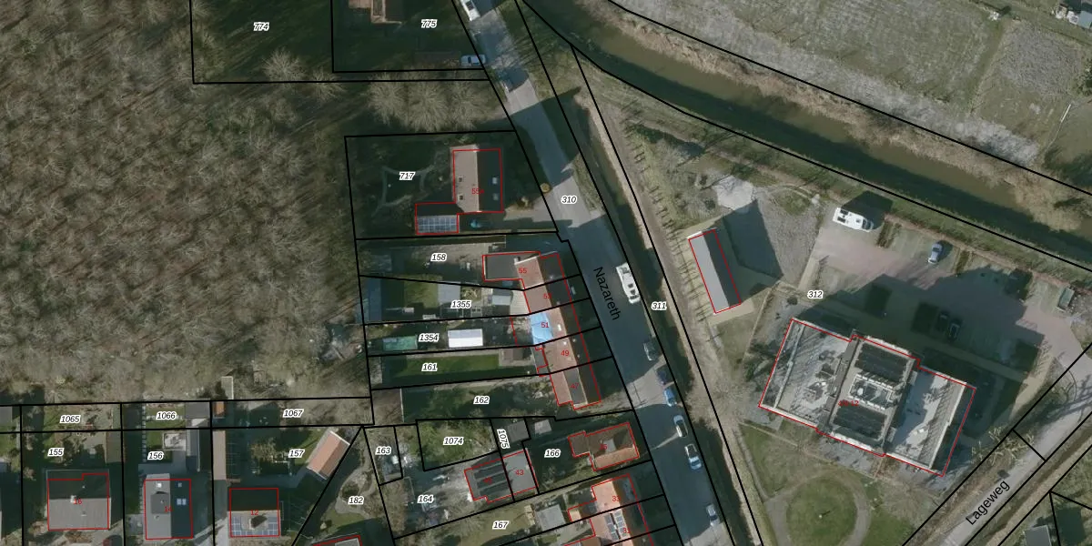 Het perceel waarop Nazareth 55 staat heeft een oppervlakte van 330 m². Dit is een groot perceel. De perceeloppervlakte wordt geregistreerd door het Kadaster. Gedetailleerde informatie over de maten van dit perceel kunt u vinden in het rapport Kadastrale kaart met maatvoering van Nazareth 55.