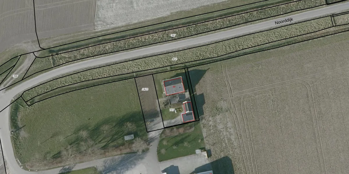 Noorddijk 50 is gelegen op kadastraal perceel GOE00AE707. Deze kadastrale aanduiding is uniek en wordt gebruikt door het Kadaster om eigendomsrechten en andere zakelijke rechten vast te leggen. Het perceel maakt onderdeel uit van de kadastrale gemeente Goes.