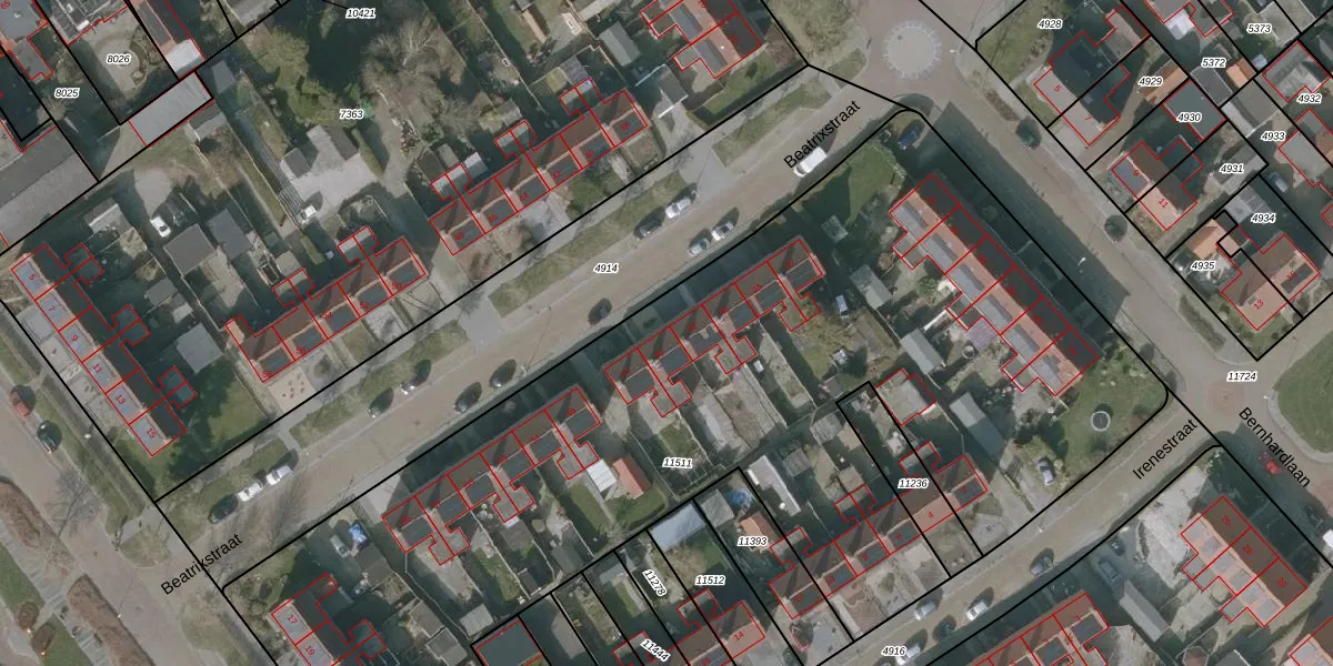 Het perceel waarop Beatrixstraat 45 staat heeft een oppervlakte van 5971 m². Dit is een zeer groot perceel. De perceeloppervlakte wordt geregistreerd door het Kadaster. Gedetailleerde informatie over de maten van dit perceel kunt u vinden in het rapport Kadastrale kaart met maatvoering van Beatrixstraat 45.