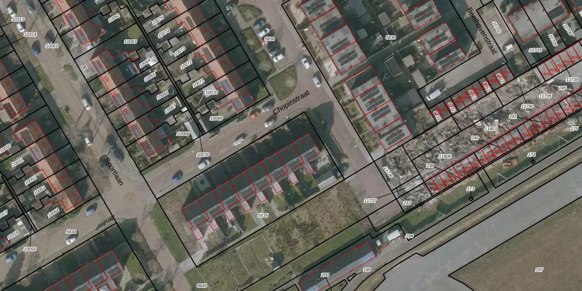 Het perceel waarop Chopinstraat 21 staat heeft een oppervlakte van 1594 m². Dit is een zeer groot perceel. De perceeloppervlakte wordt geregistreerd door het Kadaster. Gedetailleerde informatie over de maten van dit perceel kunt u vinden in het rapport Kadastrale kaart met maatvoering van Chopinstraat 21.