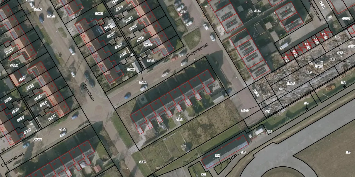 Het perceel waarop Chopinstraat 25 staat heeft een oppervlakte van 1594 m². Dit is een zeer groot perceel. De perceeloppervlakte wordt geregistreerd door het Kadaster. Gedetailleerde informatie over de maten van dit perceel kunt u vinden in het rapport Kadastrale kaart met maatvoering van Chopinstraat 25.