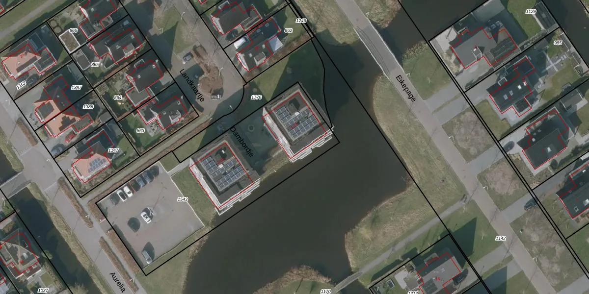 Het perceel waarop Dambordje 15 staat heeft een oppervlakte van 2154 m². Dit is een zeer groot perceel. De perceeloppervlakte wordt geregistreerd door het Kadaster. Gedetailleerde informatie over de maten van dit perceel kunt u vinden in het rapport Kadastrale kaart met maatvoering van Dambordje 15.