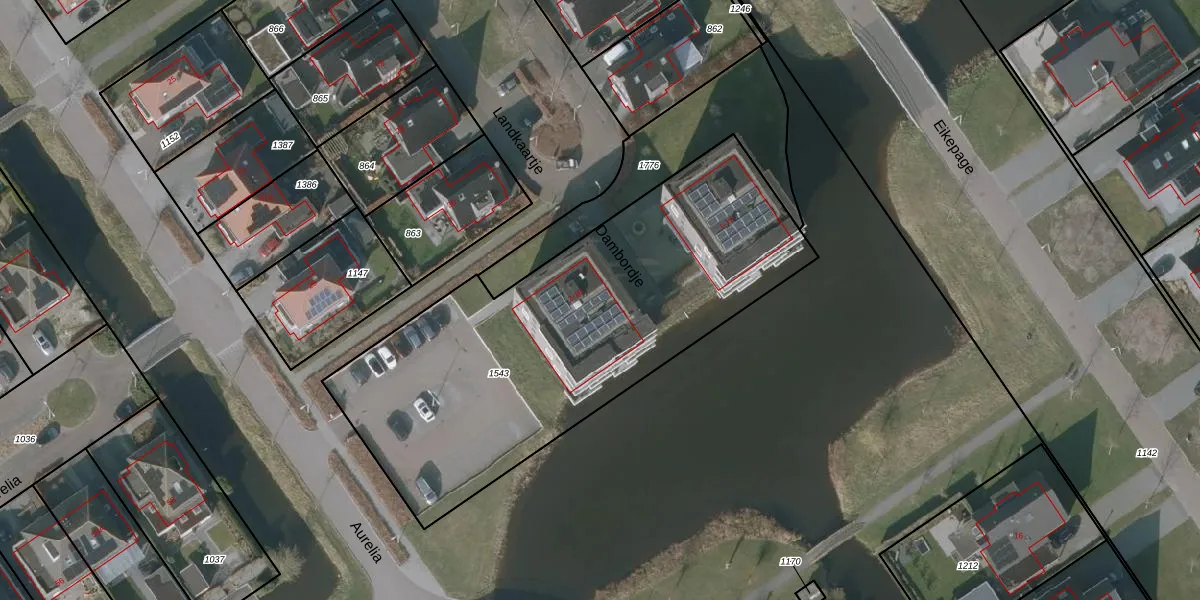 Het perceel waarop Dambordje 6 staat heeft een oppervlakte van 2154 m². Dit is een zeer groot perceel. De perceeloppervlakte wordt geregistreerd door het Kadaster. Gedetailleerde informatie over de maten van dit perceel kunt u vinden in het rapport Kadastrale kaart met maatvoering van Dambordje 6.