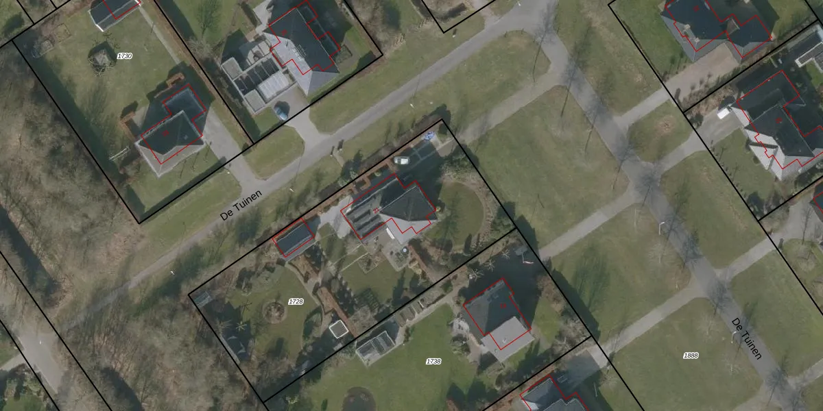 Het perceel waarop De Tuinen 21 staat heeft een oppervlakte van 2400 m². Dit is een zeer groot perceel. De perceeloppervlakte wordt geregistreerd door het Kadaster. Gedetailleerde informatie over de maten van dit perceel kunt u vinden in het rapport Kadastrale kaart met maatvoering van De Tuinen 21.