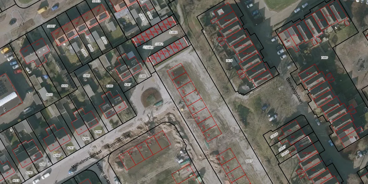 Het perceel waarop Emmastraat 30-A staat heeft een oppervlakte van 2566 m². Dit is een zeer groot perceel. De perceeloppervlakte wordt geregistreerd door het Kadaster. Gedetailleerde informatie over de maten van dit perceel kunt u vinden in het rapport Kadastrale kaart met maatvoering van Emmastraat 30-A.