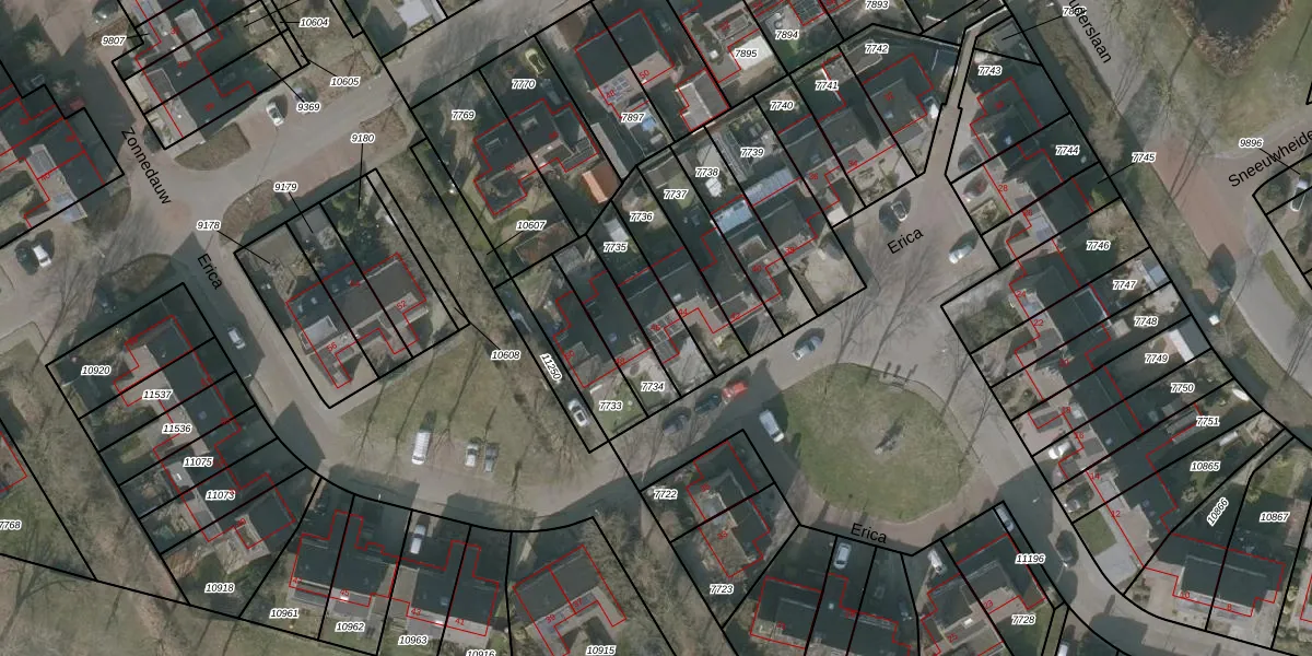 Het perceel waarop Erica 46 staat heeft een oppervlakte van 181 m². Dit is een middelgroot perceel. De perceeloppervlakte wordt geregistreerd door het Kadaster. Gedetailleerde informatie over de maten van dit perceel kunt u vinden in het rapport Kadastrale kaart met maatvoering van Erica 46.